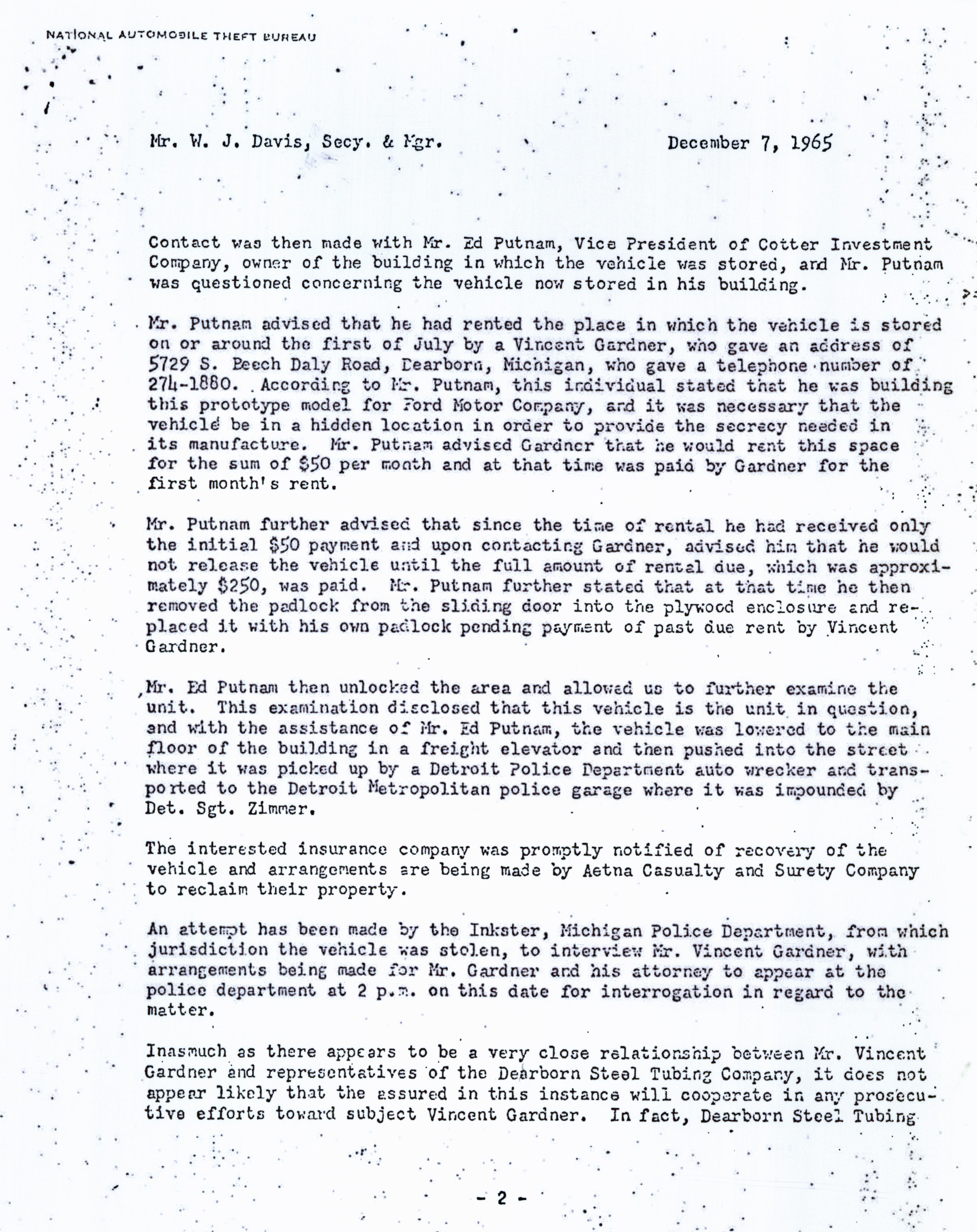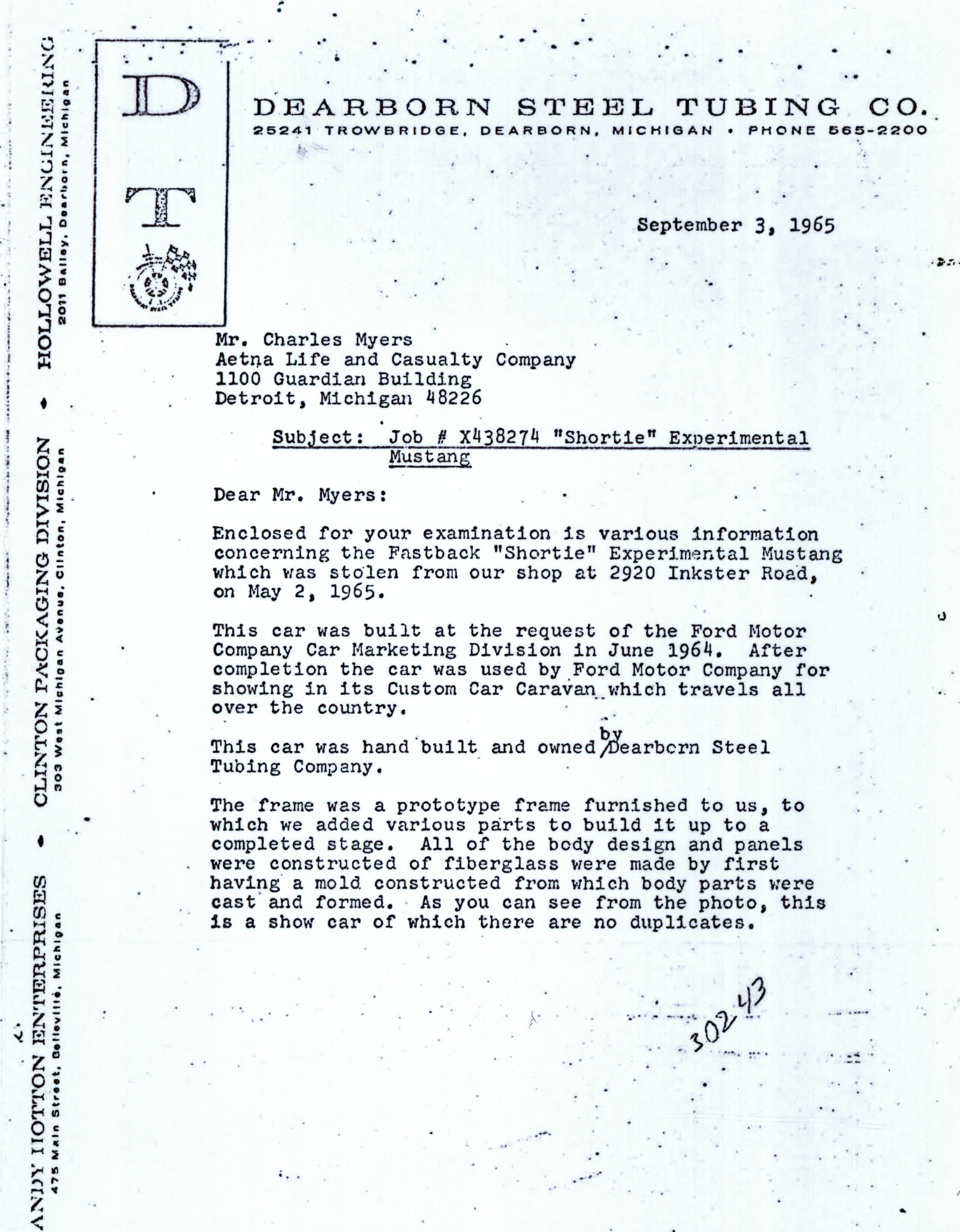 According to the September 3, 1965 DST document, "the Fastback "Shortie" Experimental Mustang..was stolen from our shop at 2920 Inkster Road on May 2, 1965."
