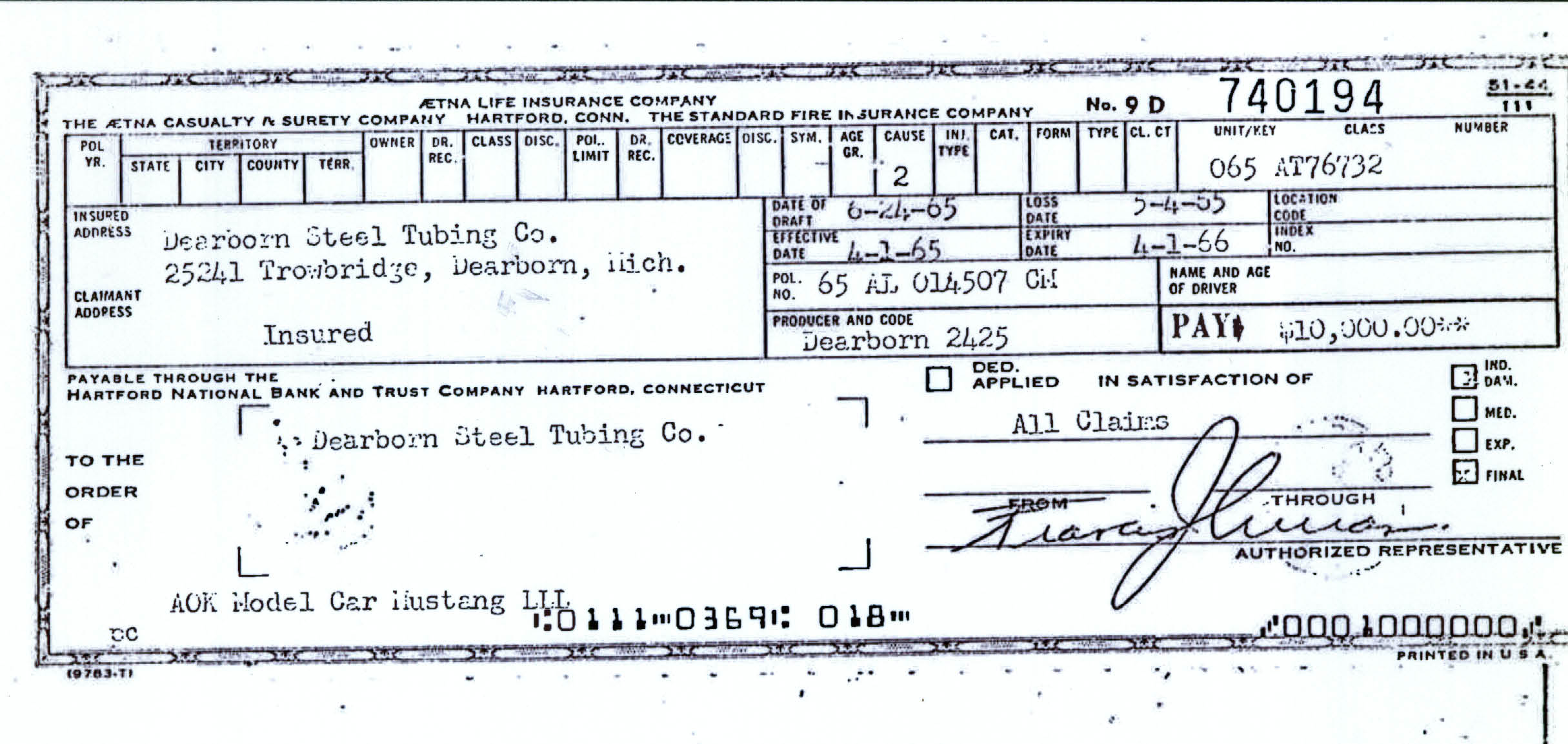 Dearborn Steel Tubing placee a claim for the Mustang III and received a check for $10,000, equivalent to $75,500 today.