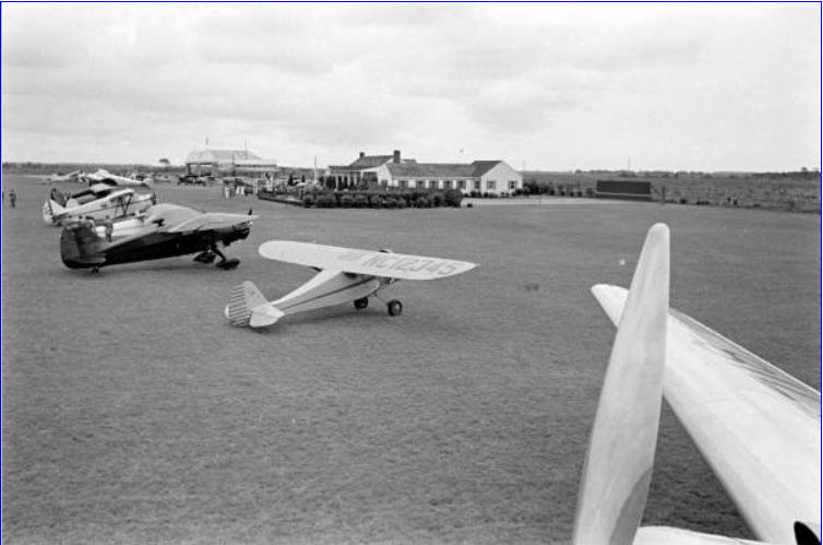 The 6th photo (lineup of a/c with clubhouse in background) - the 1st a/c Reg. # NC12345 is a Monocoupe 110, c/n 6w47. This a/c originally belonged to Peter Brooks, a LI race pilot and socialite who married Aline Rhonie, aviatrix and artist. She is best known for her mural on the Pre-Lindbergh Era of Flight which she painted in Hanger F at Roosevelt Field.