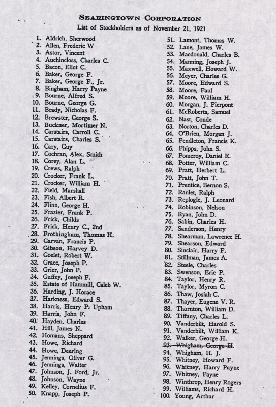 A list of the 100 stockholders of the Searingtown Corporation that owned the club as of November 21,1921. Notable members were William K. Vanderbilt, J.P. Morgan, Henry Frick, John Phipps, Edward Shearson, Payne Whitney, Joseph P. Grace, George Bourne, and Arthur Young.
