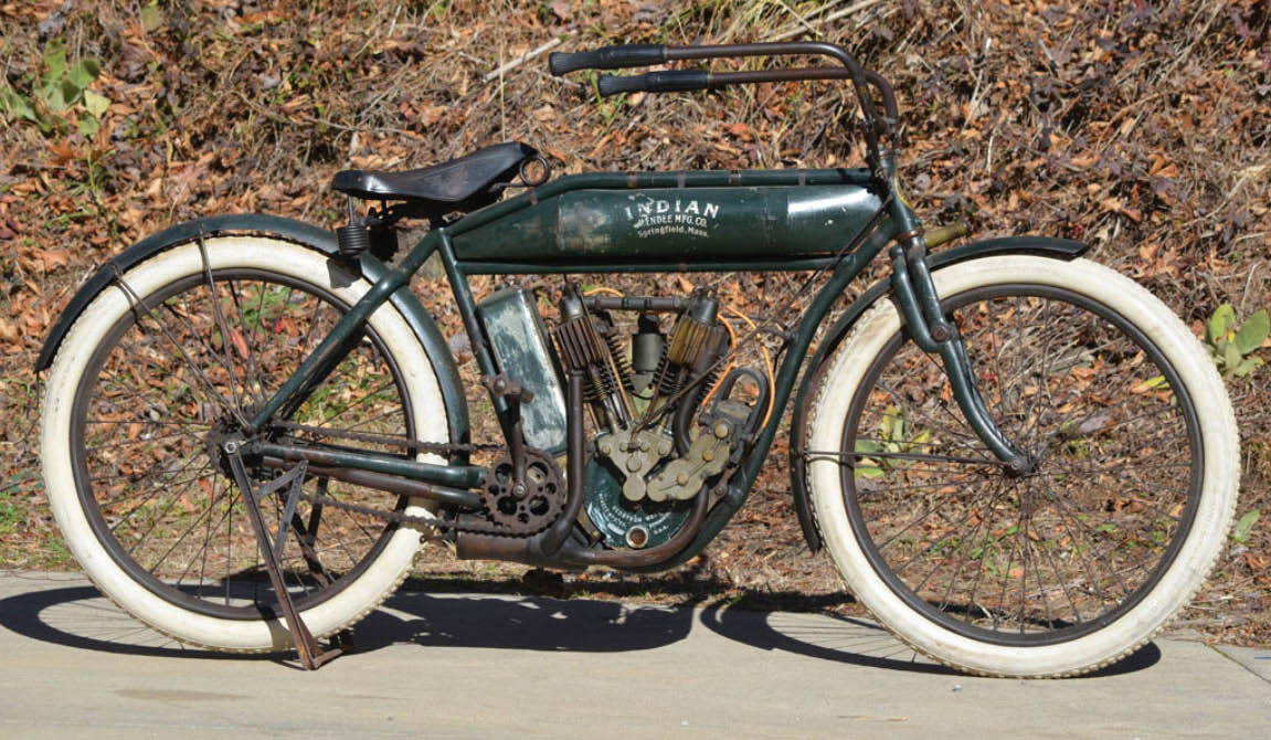 Gary Hammond: Note the torpedo-style gas tank underneath the upper frame rail, and probably green factory paint with “Indian” logo in center of the tank. The loop frame holding the engine was new in 1909.