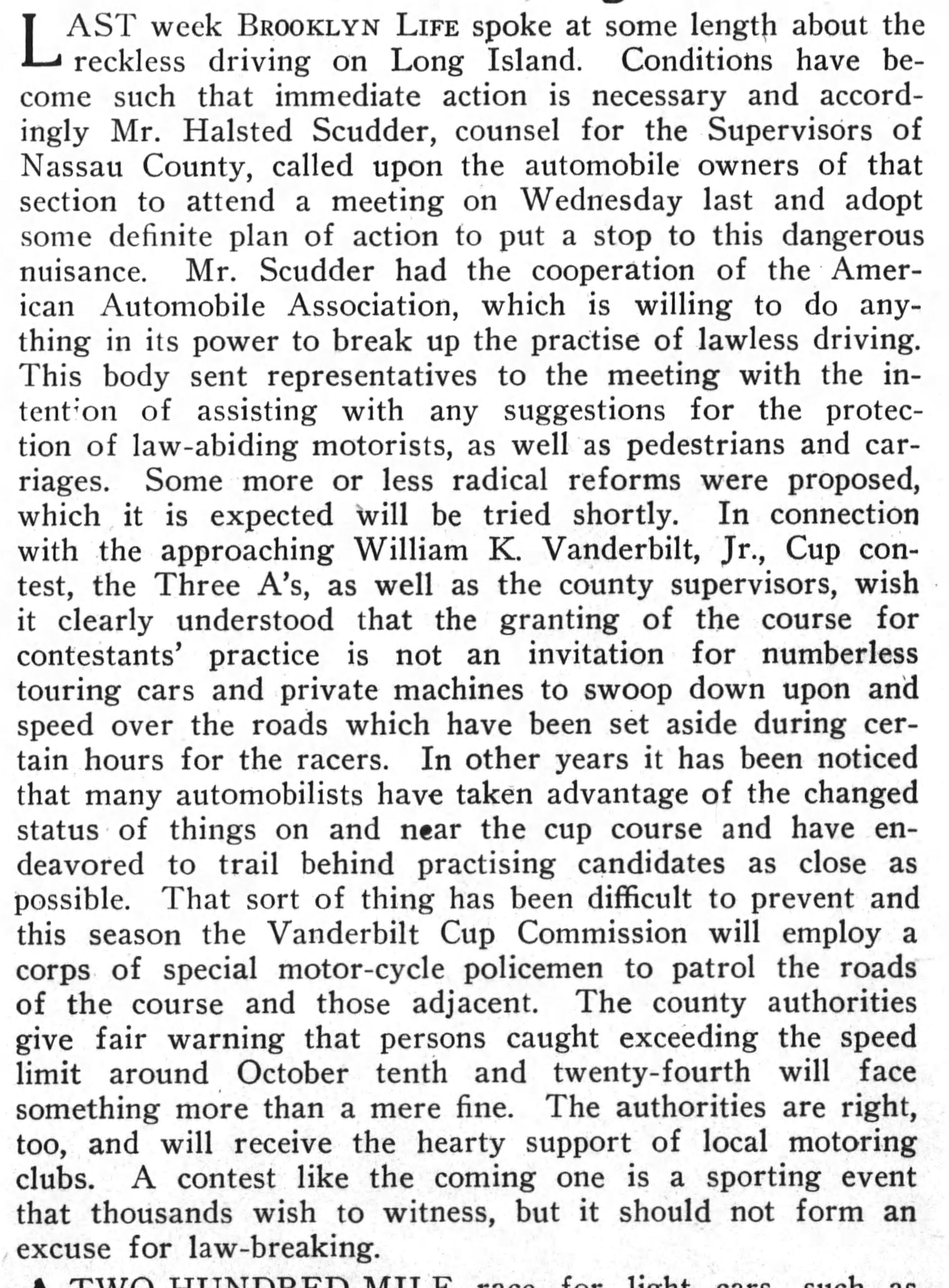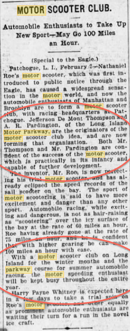Based on a Feb. 7, 1907 Brooklyn Daily Eagle article, a motor scooter club was to be headquartered in Patchogue, with none other than Jefferson De Mont Thompson and A.R. Pardington as the club’s originators. “With a motor scooter club on Long Island for the winter months and the parkway course for summer automobile racing, the motor speeding enthusiast will be kept busy throughout the entire year.”