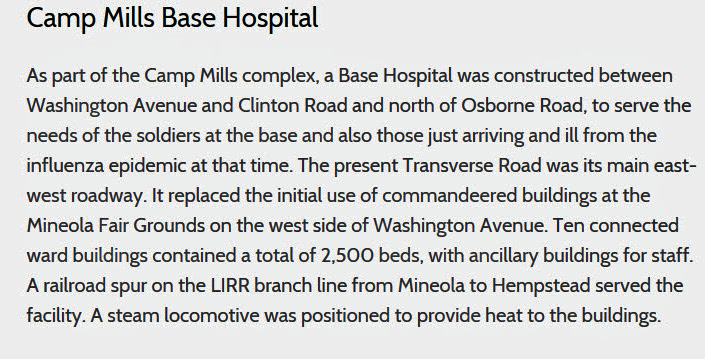 Bill has provided the following description and images of the Camp Mills Base Hospital Complex then considered Mineola, now in the Village of Garden City.