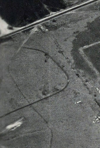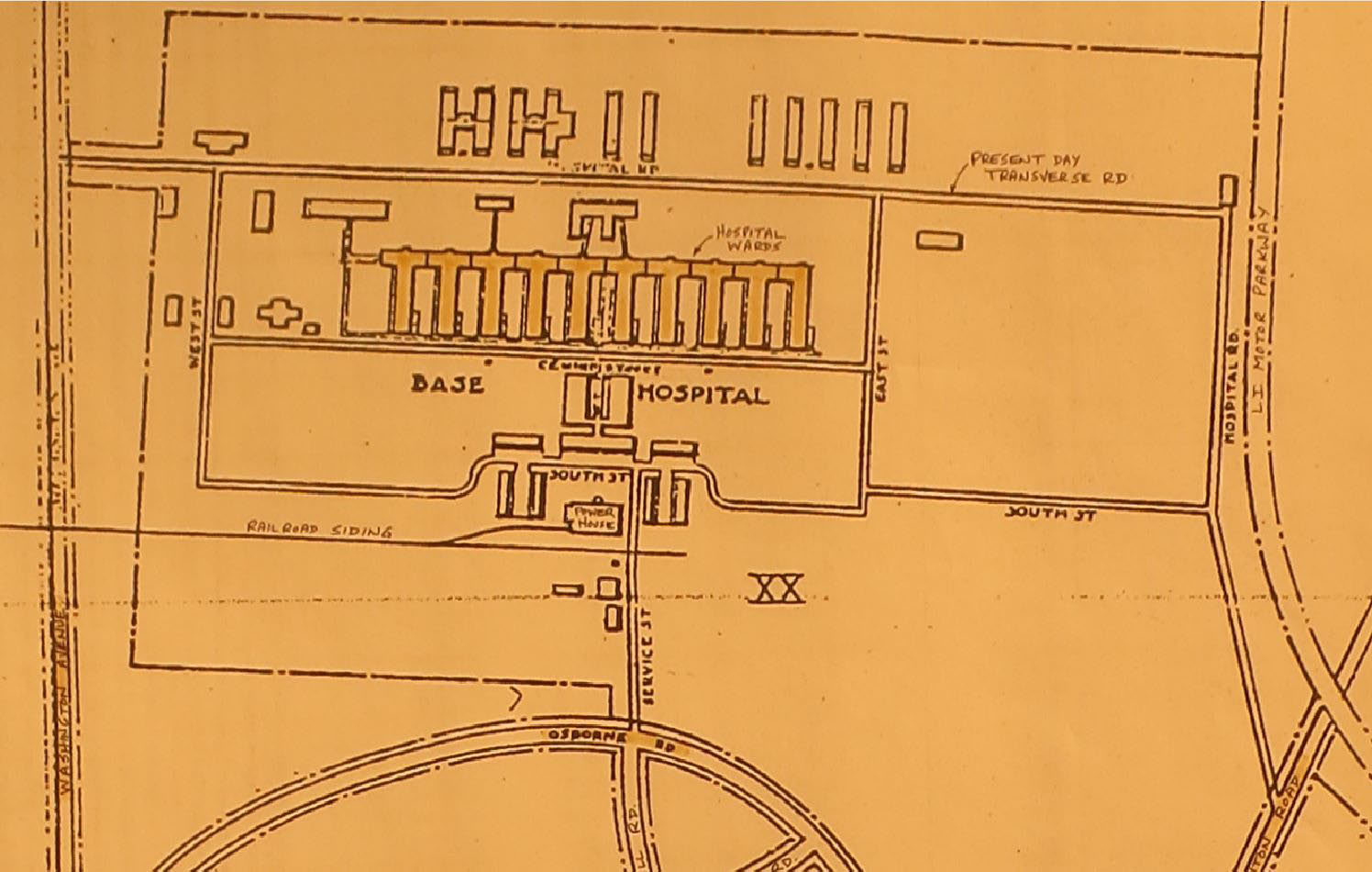 Bill Bellmer: You've identified Transverse Road on the photo. That was built for the hospital complex in 1918. Note the ten rectangles to the left of that road; they were foundations for the ward buildings for 2,500 beds. To the right of the road are foundations for ancillary buildings.