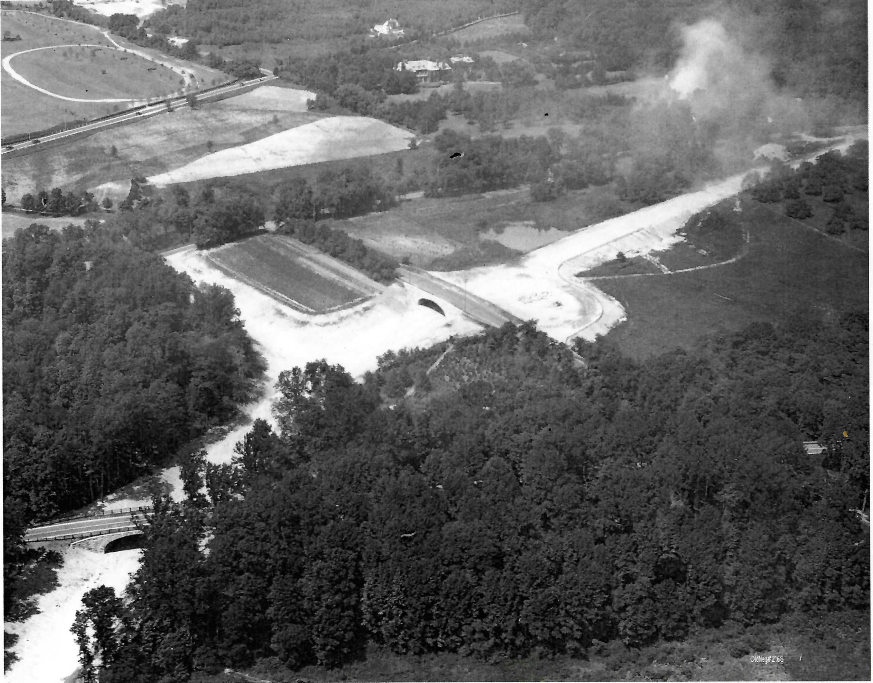 This is the Northern State Parkway under construction facing east. The overpasses for New Hyde Park rd and Motor Parkway are clearly visible on the lower left of the picture. The overpass that carried the Motor Parkway over the Northern State is below the New Hyde Park rd overpass. The date of the photo would be between 1931 to 1933. The rationale for this date is that construction of the Northern State at the Queens border started in 1931 and it reached Willis ave further east in 1933. The Motor Parkway starts at the bottom left of the photo and goes to the right, up to about the middle of the picture on the right side. The Motor Parkway bridge for New Hyde Park rd is to the right of the new Northern State overpass but is obscured by trees. Further east is the Motor Parkway bridge for Old Courthouse rd but that seems to be obscured as well. The golf course is the Links course and is now occupied by a residential community.