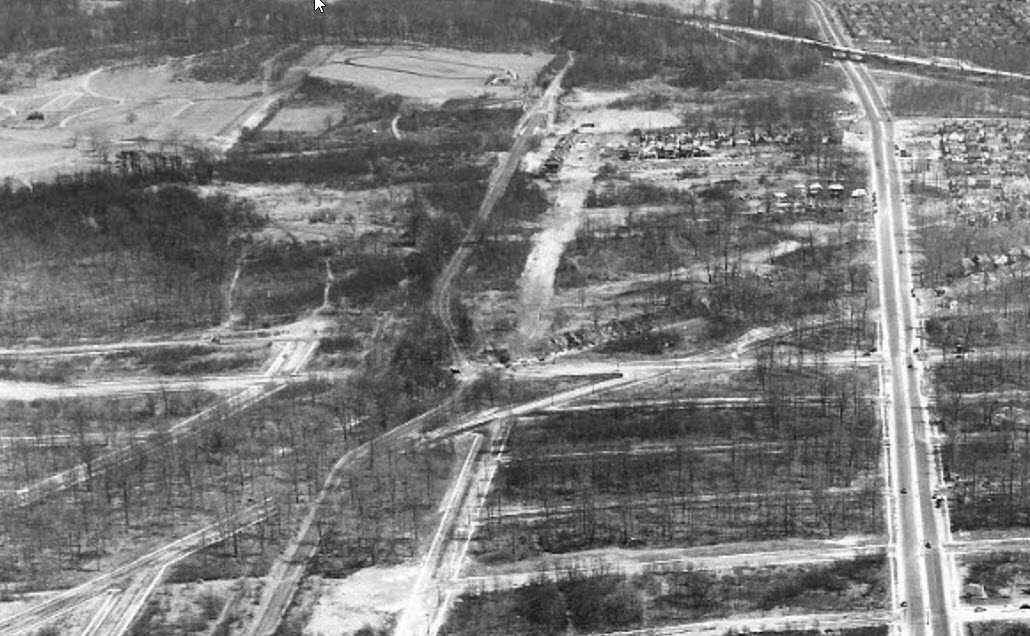 This is in Queens, NY. Aerial photographer was looking East. Know there’s the Farmway Bridge East of Springfield Blvd, near the Bungalow Lodge Home. Then the Parkway Bridges at Springfield & Bell Blvd ( curve where the RR abutments were utilized ), then at Hollis Ct. Guess this is about 1942. Toll Booth East of Springfield Blvd looks to have been removed. The present day Bell Blvd Bridge and the straightened bike path hasn’t been created yet. Think that was done around 1950?