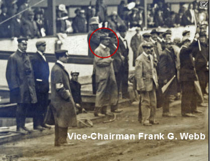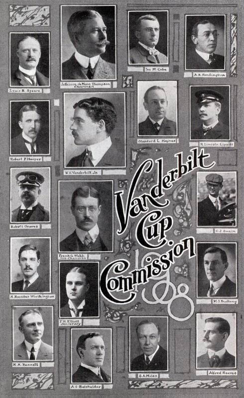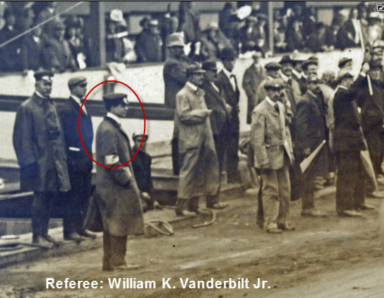 Lots of moustaches, lots of guesses. But anyway I’ll make a try. We see of course Herb Lytle, driver of the Isotta. Was Jack Tattersall still his mechanician? Then of course W.K. Vanderbilt in the foreground, behind him with the big moustache Jefferson DeMont Thompson (chairman of the Vanderbilt Cup Commission). I have the impression that the man directly on Thompson’s left is F.H. Elliott, secretary of the Commission. Then it could be that the man somewhat further towards Elliotts left side (in the light rain coat) is Frank G. Webb, vice-chairman of the Commission. The man with the megaphone seems to be Fred Wagner and the man with the checquered flag: Joe Tracy??