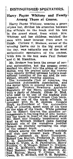 Art Kleiner: I've attached a NY TImes clipping of Oct. 11, 1908 of people that attended the Motor Parkway Sweepstakes that most likely would have been at the finish or in the grandstand, including: