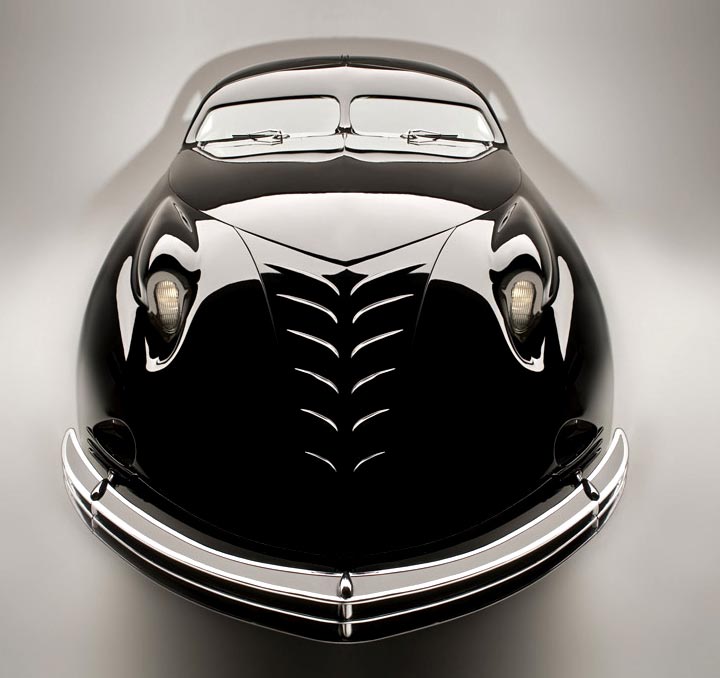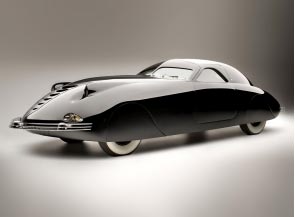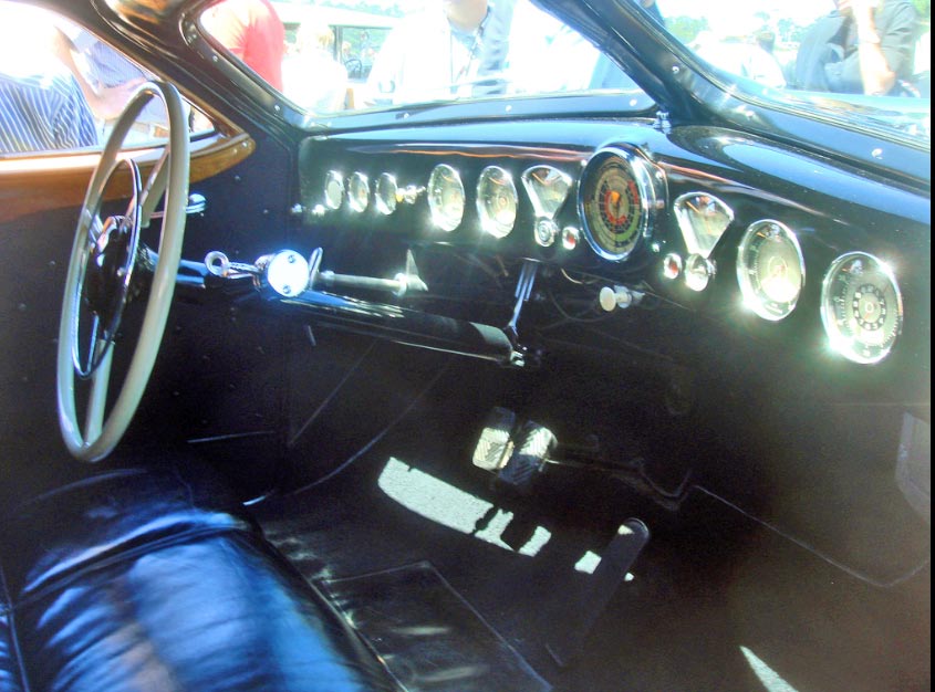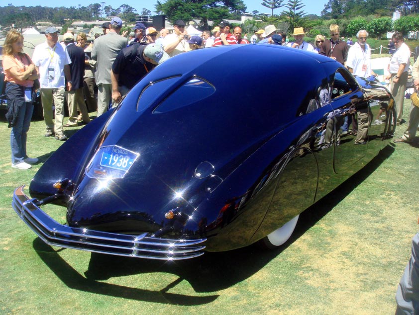 I’m not an auto buff by any means, but with some Internet searching; I’ll give this a shot. This is the 1938 Phantom Corsair. Rust Heinz conceived this cars design, and had the Bohman&Schwartz; Coach Building company develop it. Mr. Heinz wanted this car in a limited production, but his untimely death in a 1939 car accident put a halt to this. So, only 1 car was produced. This car was featured as the “Flying Wombat” in the 1938 film The Young at Heart. TV personality Herb Shriner owned this car between 1951 and 1970.The Alco Black Beast (current owner, Mr. Kroplick), was once in the William F Harrah collection; which is where the Phantom Corair currently resides.