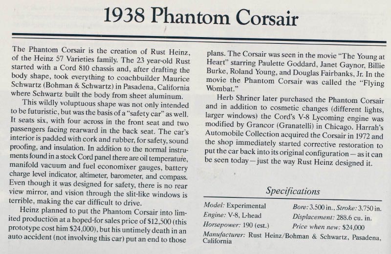 Rust Heinz, heir to the ketchup fortune, funded the development of the car and assisted in its design. The primary designer was Maurice Schwartz of Bohman & Schwartz Coachbuilding Company of Pasadena, California. The planeed sales price for the Phantom Corsair was $12,500 equal to $207,000 today.