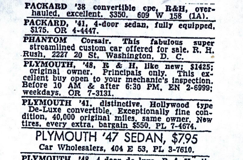 The Phantom Corsair being advertised for sale in The New York Times on June 25, 1950. (Submitted by Art K.)