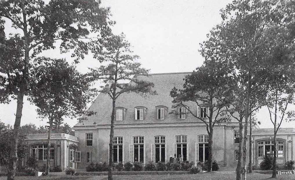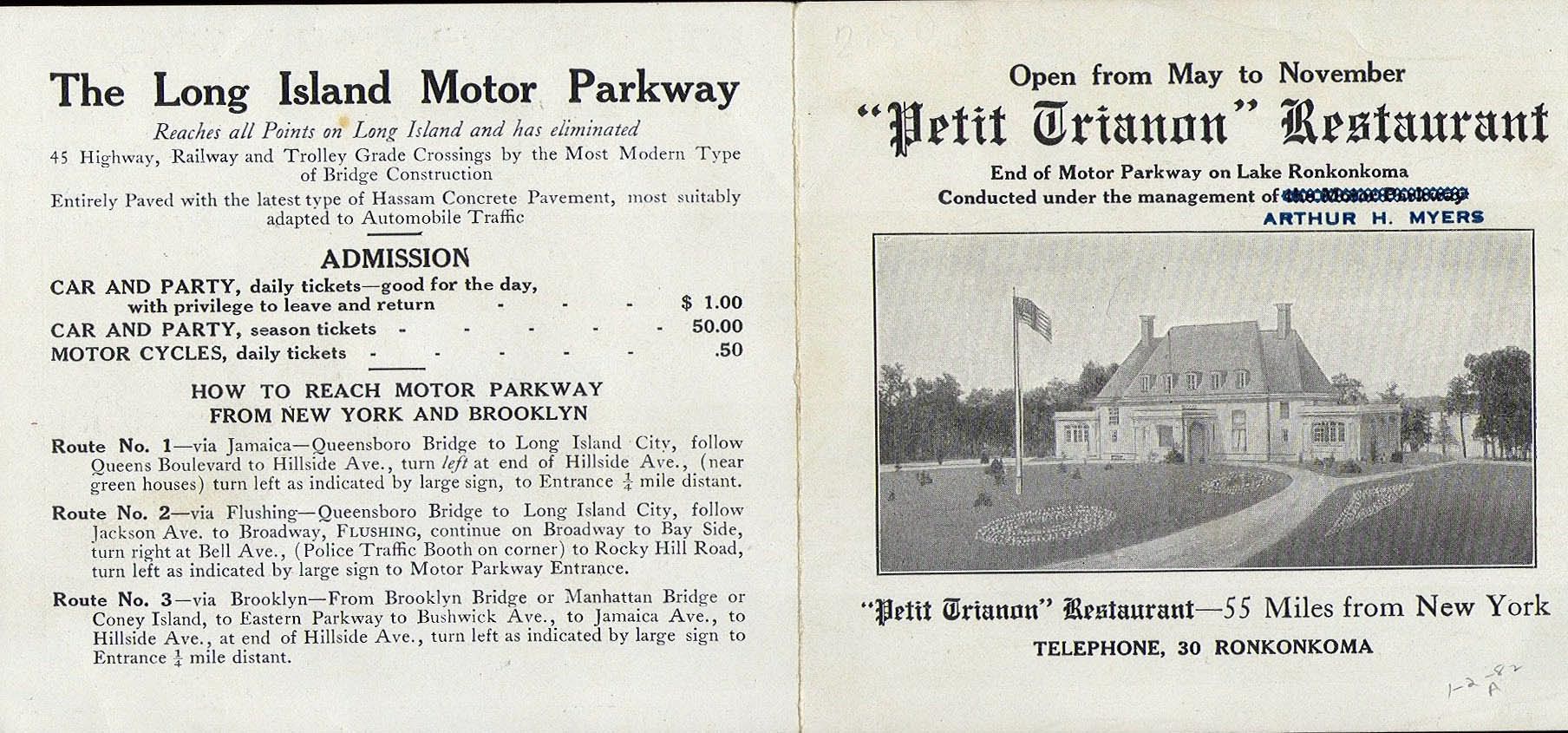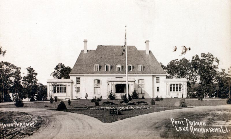 I’m guessing the Petit Trianon Inn’s circular driveway, the exit side on the north end of the structure. The arched windows resembles the Petit’s. We’re facing east at the hidden Lake Ronkonkoma in the back. Appears to be gas or oil for sale on the left of the picture as you exit. Based on the parked cars, I’d say we’re in mid ‘20s? I see at least one Ford in the pic.