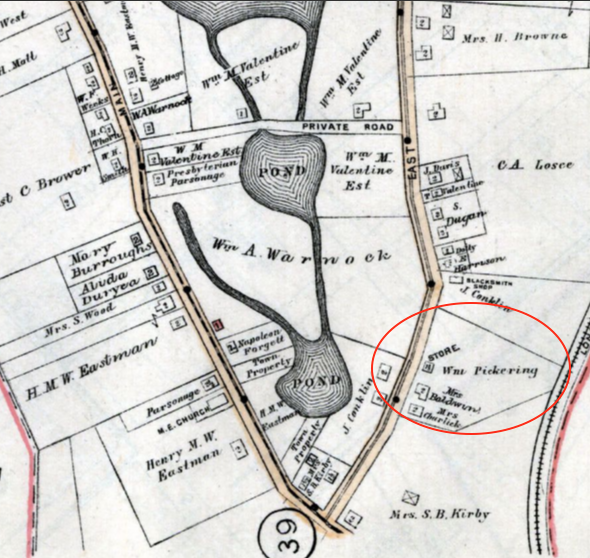 East Broadway in Roslyn. The boook “Nassau County Long Island, in Early Photographs” indicates the Pickering shop was at 193 East Broadway. Looking south possibly.