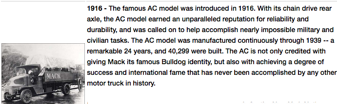 Identify the manufacturer, model and year of the truck: Mack, AC Bulldog, 1916