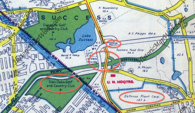 We’re looking west, southwest at the Northern State Parkway in Lake Success. The lower overpass bridge (white) is Lakeville Road. Just above that (darker) is the abandoned LIMP bridge, to the left of the trees, at a diagonal to the top left corner of the pic is the route of LIMP. Not sure of the name of the golf course above that, I think Glen Oaks, but that’s where the hi-rise North Shore Towers is now. Back down toward the bottom, this eastbound Lakeville Rd exit out to Marcus Ave. was built in 1952. Before that it was just about 2 car lengths this side (east) of the Lakeville Rd bridge. I’ve seen pics during the construction of this exit/entrance with all of the heavy road grading/earth moving equipment, contractor sheds, etc. quartered on the east side of it & it looks like the ground is still scarred from it there. Also looks like a remnant of the original exit (dirt maybe) is still seen just this side of the bridge so I’m gonna guess the pic is from 1952 or ‘53. The UN went to Fresh Meadows in 1951 so the parking lot at left is Sperry Gyroscope, changed sometime in the ‘50s to Sperry/Rand Corp., bordered by Lakeville Rd. The triangle between Lakeville Rd. & LIMP is the Schumacher farm. To it’s left would be the start or expansion of the L.I. Jewish Hospital (formed 1949).