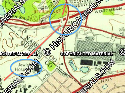 Northern state parkway, lakeville rd overpass, motor parkway overpass just north of it. Sperry property with the cars parked, LIJ hospital being built? 1945?