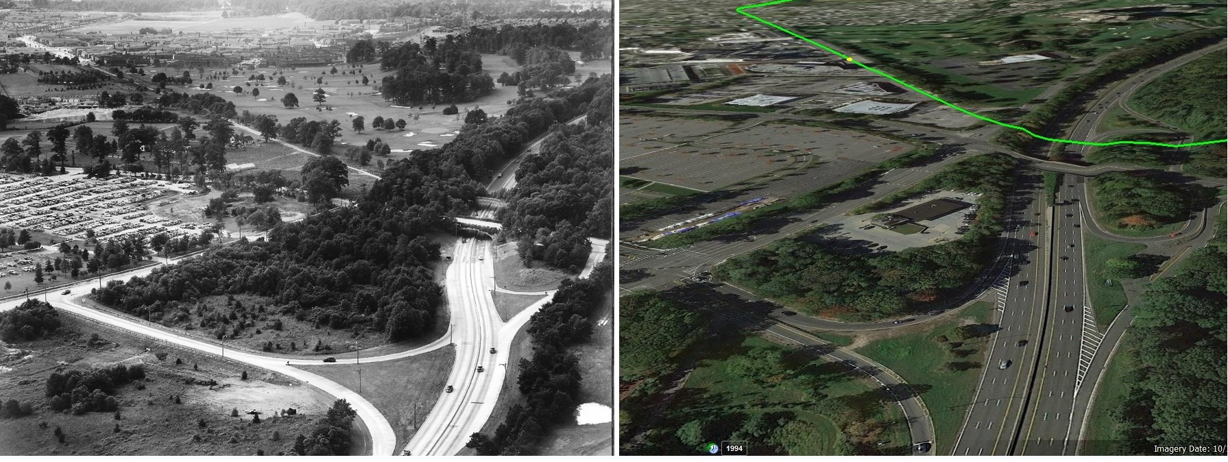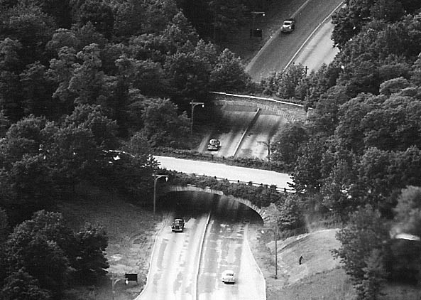 Above the Northern State Pkwy looking West down at the two Robert Moses bridges built over the pkwy in Lake Success. One for the LIMP, the other for Lakeville Road.