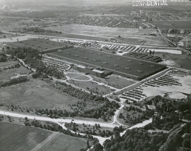 o They are parked at the sperry defense plant.