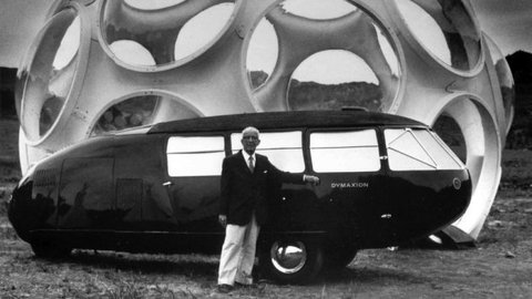 As written on Bfi.org: "The Dymaxion car was designed by Buckminster Fuller in the early 1930s. The car featured highly innovative, and ultimately influential, features compared with the common car of the day including: a three wheel design with rear wheel steering and front wheel drive, a longer body (20 feet), and a highly aerodynamic design. Success of the design was realized in its performance efficiencies: the car could transport up to 11 passengers, reach speeds of up to 90 miles per hour, and ran 30 miles per gallon."