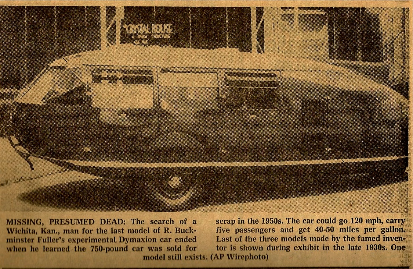 The Dymaxion #3 shown in front of the Crystal House at the Chicago World's Fair in 1934. Art Kleiner found the photo in the final edition of the Long Island Press, March 25, 1977.
