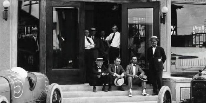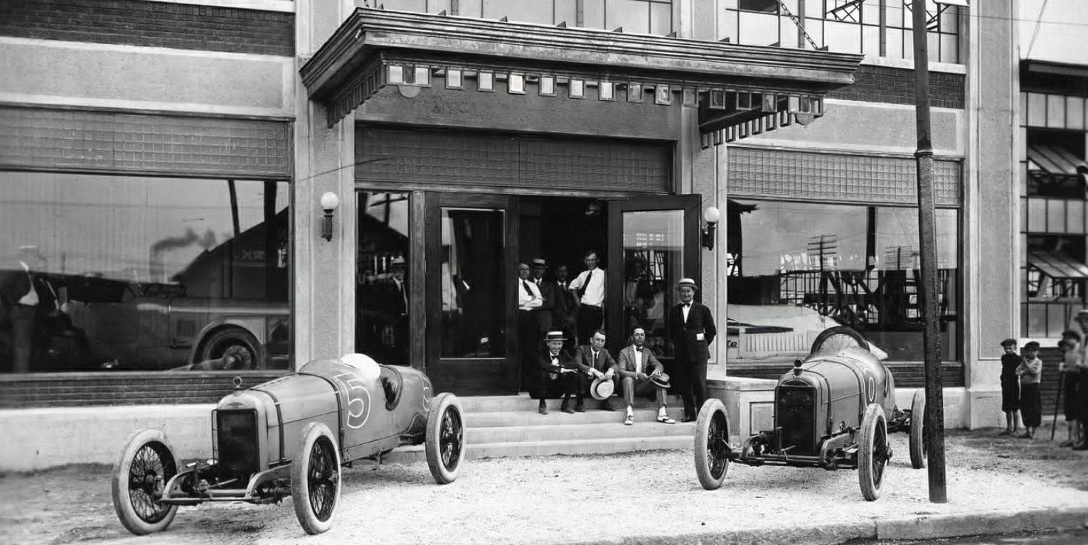 The photo was taken in front of the Duesenberg factory in Indianapolis, IN in 1921. The Duesenberg racing team had recently won the 1921 French Gran Prix making it the first American team to do so. Jimmy Murphy was the winning driver. The two men in the white shirts are the Duesenberg brothers. I believe that’s Fredrrick on the left with August on the right.