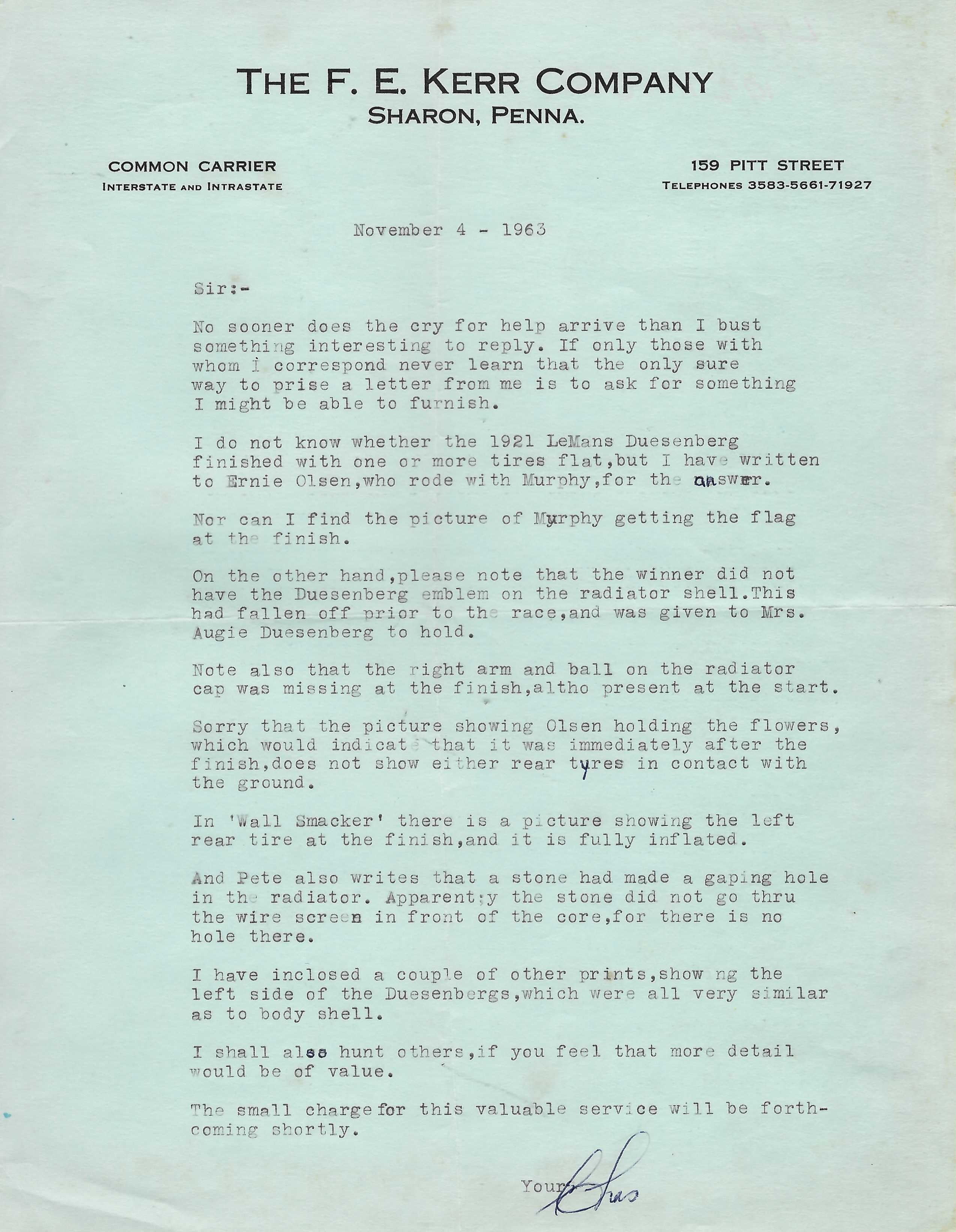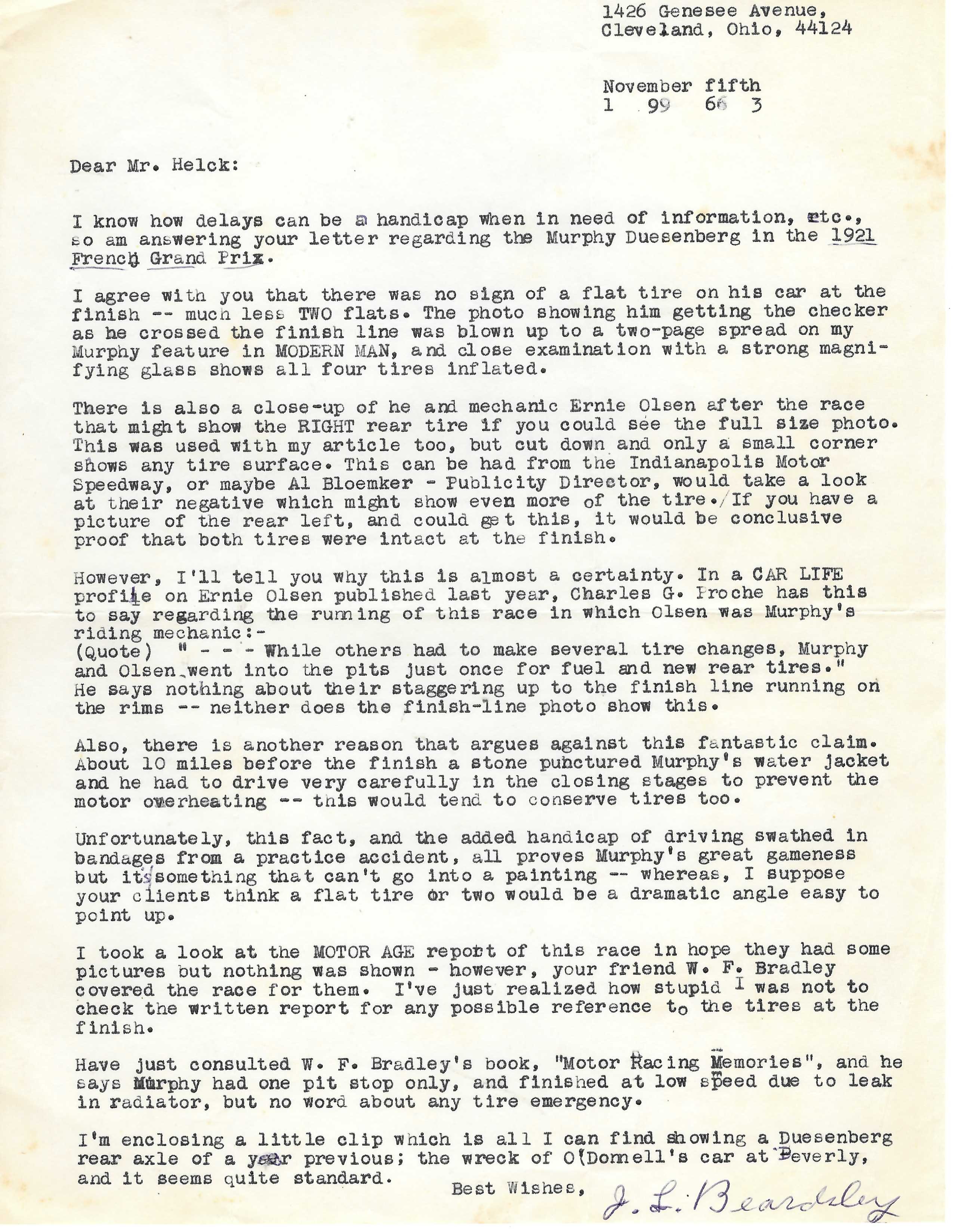 Even into the 1960's Helck had some issues with the mechanical state of the car that finished the race. He contacted some of his magazine reporter friends to inquire.
