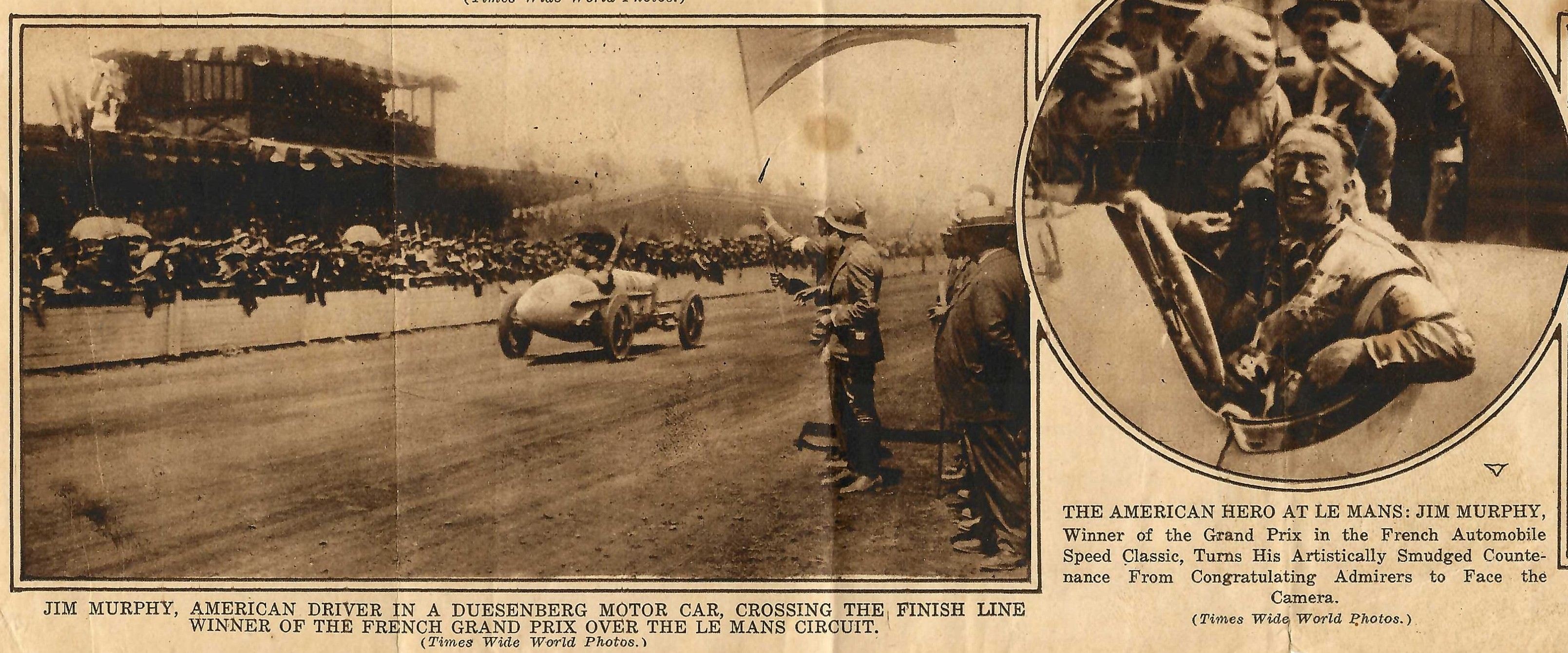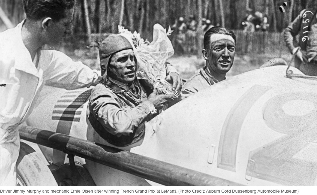Winning driver Jimmy Murphy and mechanic Ernie Olsen just after winning the 1921 French Grand Prix. Murphy bought the damaged car after the race. He went on to repair the car, swap the Duesenberg engine for a Miller engine and subsequently entered, and won the 1922 Indy 500 with the car.