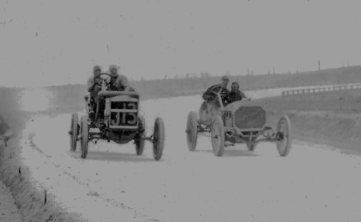 Sept 10, 1908 Motor Parkway Sweepstakes. J-13 Maxwell driven by Charles See, finished 4th for the Jericho team. The other racer’s radiator resembles a Mercedes-Simplex (bottom photo below), so possibly the P-43 Simplex driven by Frank Lescault, finished 4th for Motor Parkway team. Radiator does not resemble the winning P-42 Isotta driven by Herbert Lytle (middle photo below).