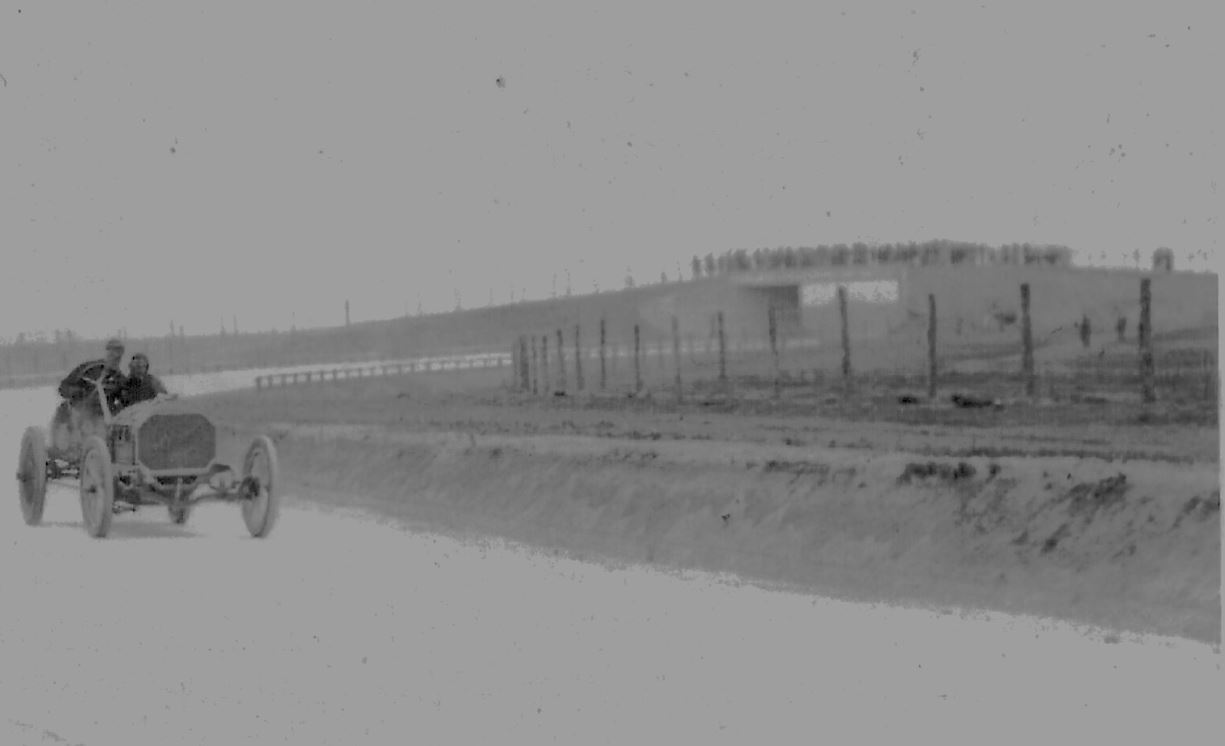 I think that’s the number J13 Maxwell with Charles See driving alongside L. B. Lorimar driving a Maxwell. See finished 4th. in the jericho Sweepstakes while Lorimar finished 6th. in the Garden City Sweepstakes, two of the five concurrently run races that took place on October 10, 1908. The bridge could be the Bloomingdale Road “highway bridge” over the LIMP.