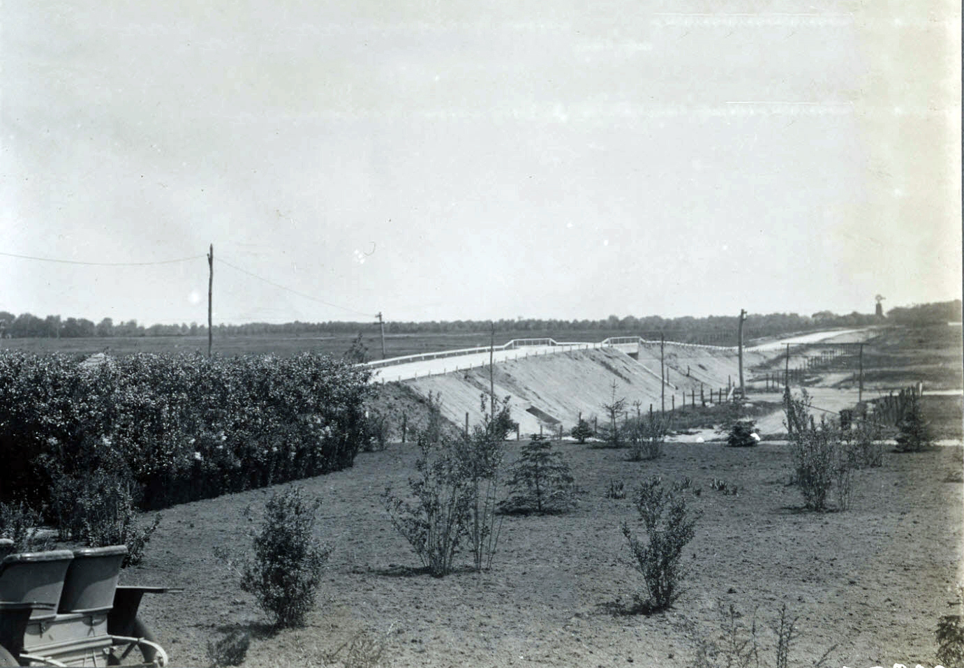 I’m not overly confident this week but I think we’re looking east with the Merrick Avenue bridge in the center because of the Ladenburg windmill in the distance. I think the photographer was set up on the property of the Meadowbrook Lodge. Could that be the tip of the peak of the lodge almost entirely hidden by the trees and bushes? Other structures include the Newbridge Avenue (Bellmore Road) bridge in the distance. Also, I think I see the structure awaiting the LIMP entrance sign on the west side of Merrick Avenue. There is also a drainage culvert under the LIMP and what appears to be a delivery vehicle for the shrubs. Since the quantity of shrubs appear to be awaiting placement elsewhere on the LIMP, I think the date could be around September, 1908 just before the opening of the parkway the following month.