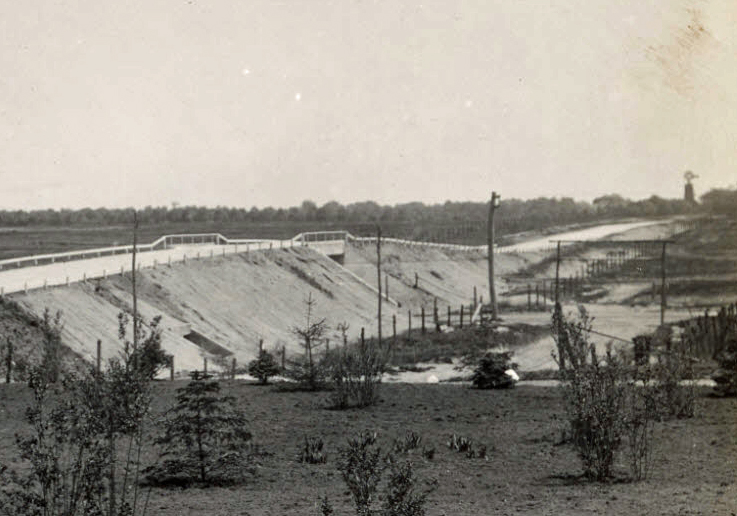 This is the south side of the LIMP facing east, just west of Merrick ave. A newly constructed bridge carrying the LIMP over Merrick ave can be seen in the center of the photograph. In the distance to the right is the Ladenburg windmill. Below that, in the foreground to the right is the archway over the entrance to the LIMP at what would be the Meadowbrook lodge. The photographer is probably pretty much standing on the site of the lodge building facing east. The sign is not finished and the entrance ramp is also not completed dating this photo probably just before the parkway opened in October of 1908.