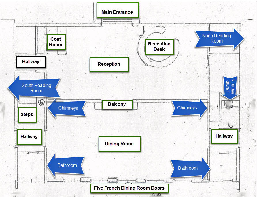 Petit Trianon’s Dining/Dance room looking South, with the garden balcony hanging overhead (Bob DeStefani was right on!). Visible are the stairs in the reception room through the doorway that is SW of the Dining area. The stairs are South.