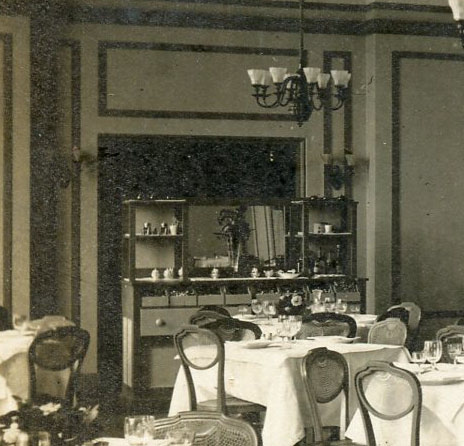 The detail of this real photo postcard is wonderful - note the narrow board wood floor, the metal lighting fixtures, the caned back chairs, and glassware on the tables. The back service area seems to contain bins for the different silverware, along with other serving pieces including creamers & sugar bowls, also some liquor bottles. You can see the arch of the ceiling, and at least three colors on the walls and trim.