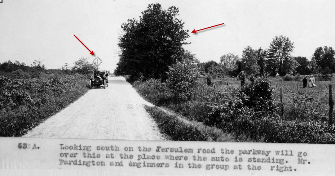 Jerusalem Road Motor Parkway Bridge (now Stewart Avenue in Bethpage. The photographer was looking south toward the LIRR crossing sign of the Central Rail Road. In addition to the RR sign, the massive tree adjacent to the north embankment is a big clue.