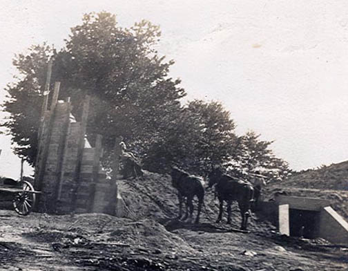 This is the construction of the LIMP bridge over Jerusalem rd (Stewart ave) in Bethpage. The photographer is facing south and the LIRR crossing sign is visible on the south side of the bridge. This picture was taken August 20, 1908. To the right, on the west side of this picture was where the LIMP groundbreaking ceremony to place.