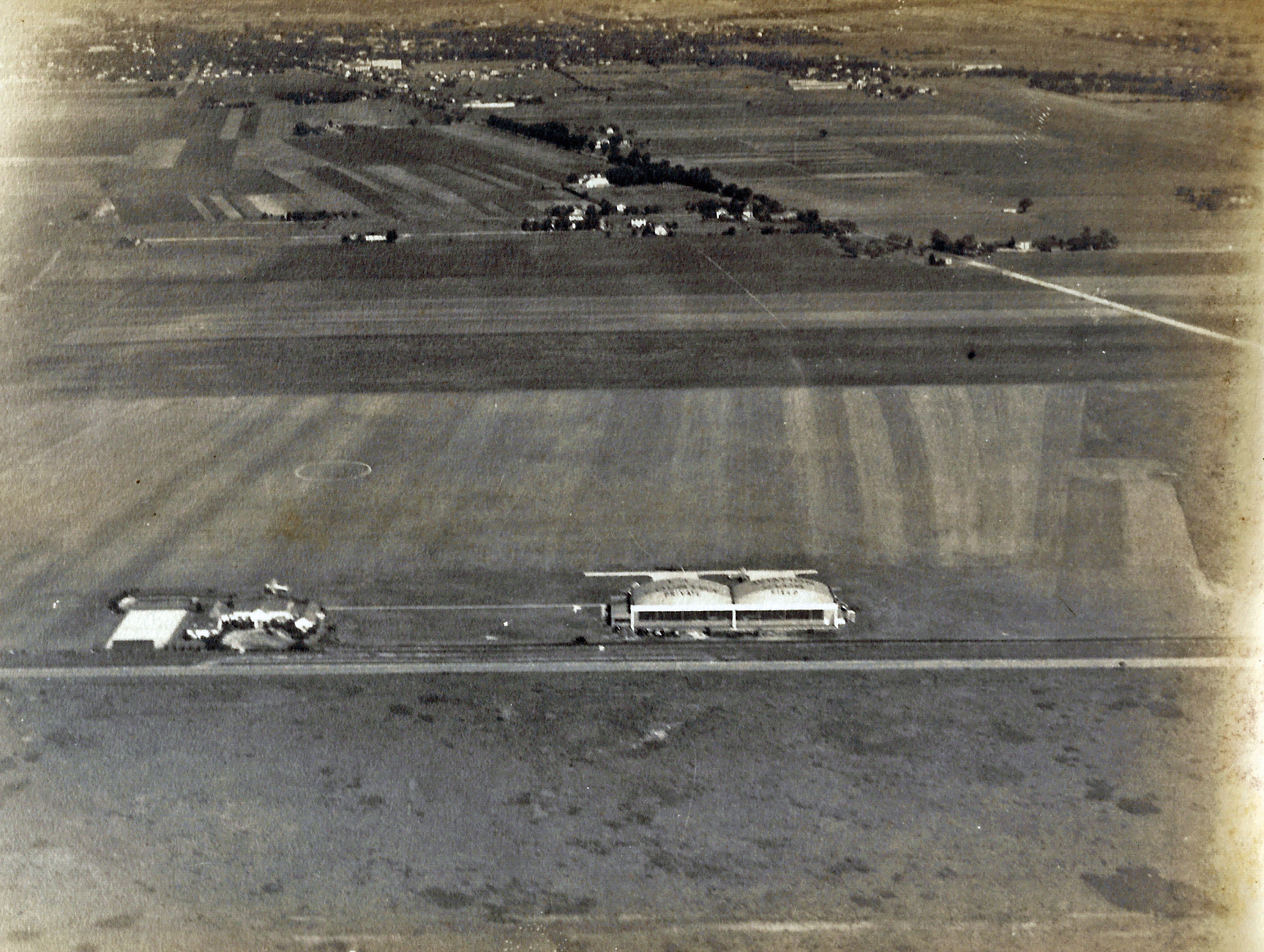 - C. Long Island Aviation Country Club, likely June 1936. The Motor Parkway can be seen below the hangars.