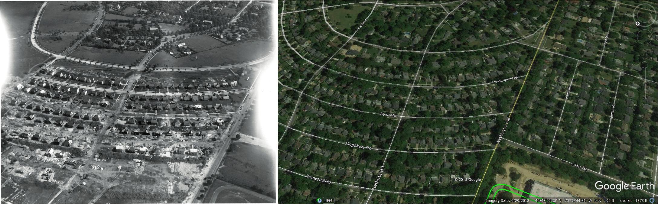 Howard, B photo, that section of Garden City looking south with Washington Ave. on the right and Clinton R. on the left. with Osborne Rd. across the top and Wetherill Rd up the middle. That curved section at bottom right is part of the racetrack of the Agricultural Society at the Mineola Fair. The Motor Parkway is just out of sight on the left side center below the fifth crossroad, Kenwood Rd.