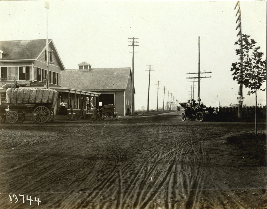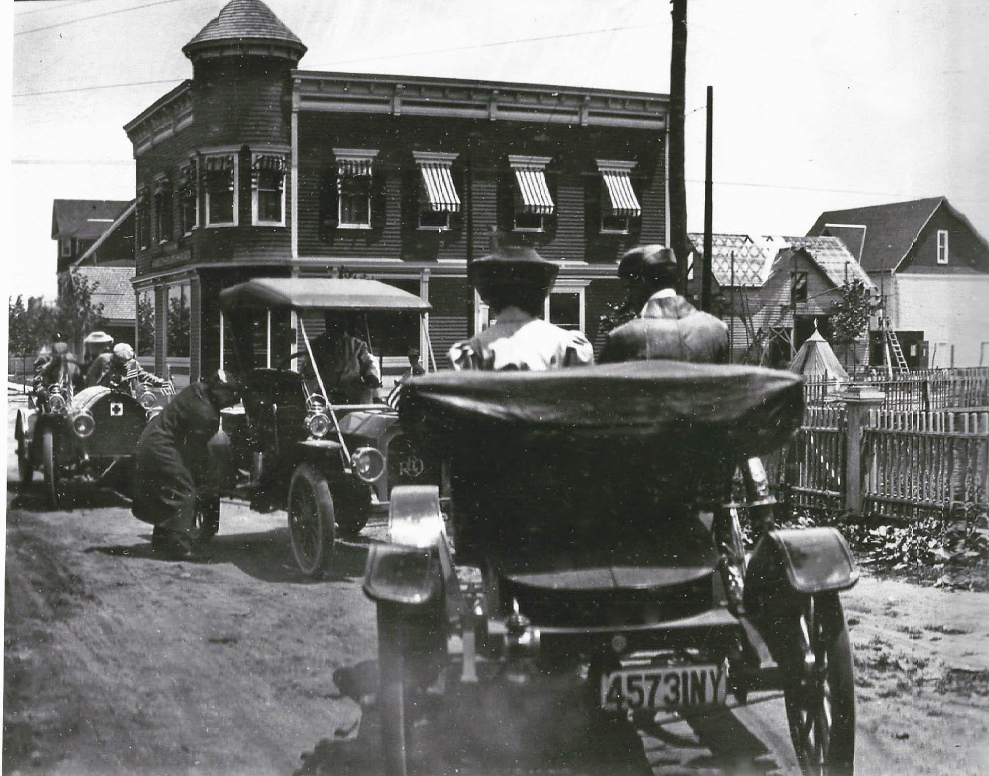 The photo is looking east on Jericho Tnpk. The cross street is Willis Ave. Krugs was on the northwest corner of the intersection. It was the headquarters for automobilists at the time. They may have been touring the hotels on the race course. The Teddy bear on the car is for Theodore Roosevelt, President in 1908. I think there is an REO Speedwagon in the photo. Perhaps surprising are the phone wires, and the fact that there are no lanes for traffic. Lastly, the building still standing is the brick one on the northeast corner of Jericho and Willis, facing Jericho.