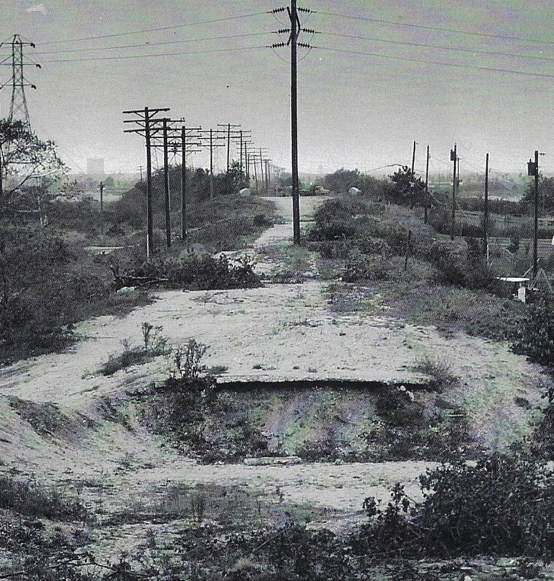 This 1955 photo was taken east of Newbridge Road in Levittown. The photographer was looking west towards the remaining abutment of the Newbridge Road Motor Parkway Bridge. The photographer is standing on Carnation Road looking west towards the Newbridge Road intersection. The abutment stood on the spot where Salisbury Park Drive will eventually terminate when completed. To the photographer's immediate left is now the site of the East Meadow Fire Department.