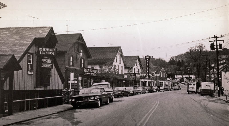 That’s Old Northern Blvd. in Roslyn looking east toward East Broadway. The first car on the left is a 1960 Oldsmobile. The fourth vehicle looks like a 1961-62 Chevy so I’ll guess about that year for the photo. The Tea House is the 18th. century Roslyn Grist Mill. The Roslyn Savings Bank is on the corner with East Broadway. Could that be part of the Mackay mansion above and behind the Anchorage Bar & Grill sign?