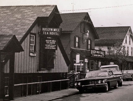 Identify the major buildings. Roslyn Boar & Tackle, the Roslyn Mill Tea House, historic records from the Nassau County LandRecord lookup includes structures next to this as The WheelBarrow Restaurant, Muddwater, Inc., a bowling alley and Ball Room Productions. And current today is the not-for-profit Junior League of the North Shore Thrift Shop which at one time housed a launderette. `