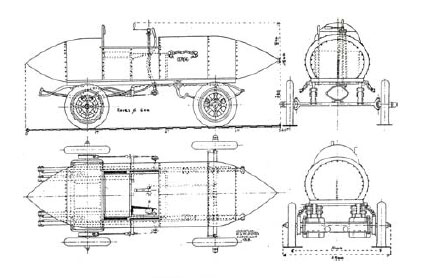 La Jamille Contente (Never Satisfied), a torpedo-shaped electric racer.The body was made of an early alloy of aluminum, tungsten, and magnesium. Powered by two electric motors that were geared direct to the rear wheels it ran on pneumatic Michelin tires and was steered by a tiller.