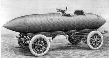 Camille Jenatzy, “the Red Devil” and his aero car named “La Jamais Contente”—“The Never Satisfied”—from 1899. Jenatzy became the first driver to pilot a road vehicle to speeds over 100 kph, or 62 mph. He drove a Mercedes in the ‘05 and ‘06 Vanderbilt Cup Races.