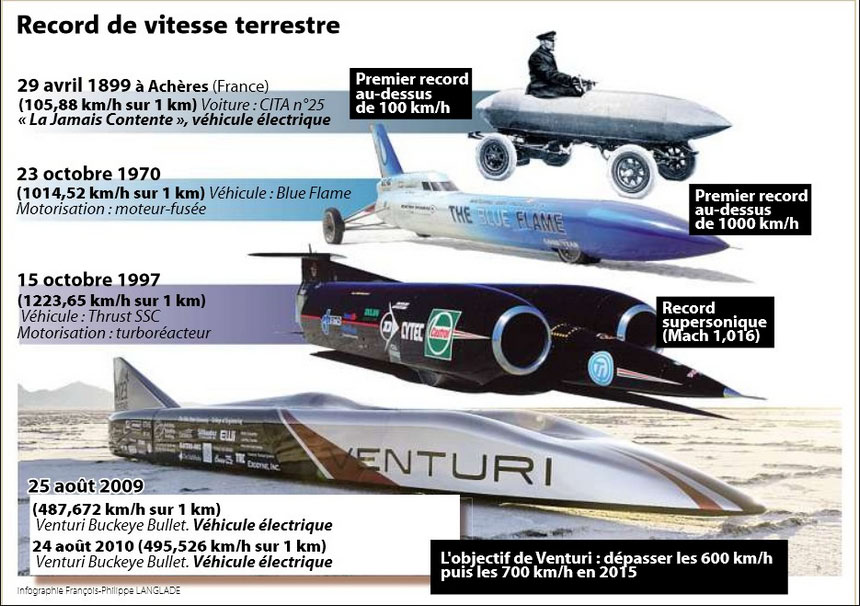 La Jamais Contente was the first automobile to exceed 100 kilometers per hour. The record 105 kpm (65.79 miles per hour), a new land speed record, was set by Camille Jenatzy in Acheres, France on April 29, 1899. Three historical markers were placed at the location in 1999 to commemorate its 100th anniversary.