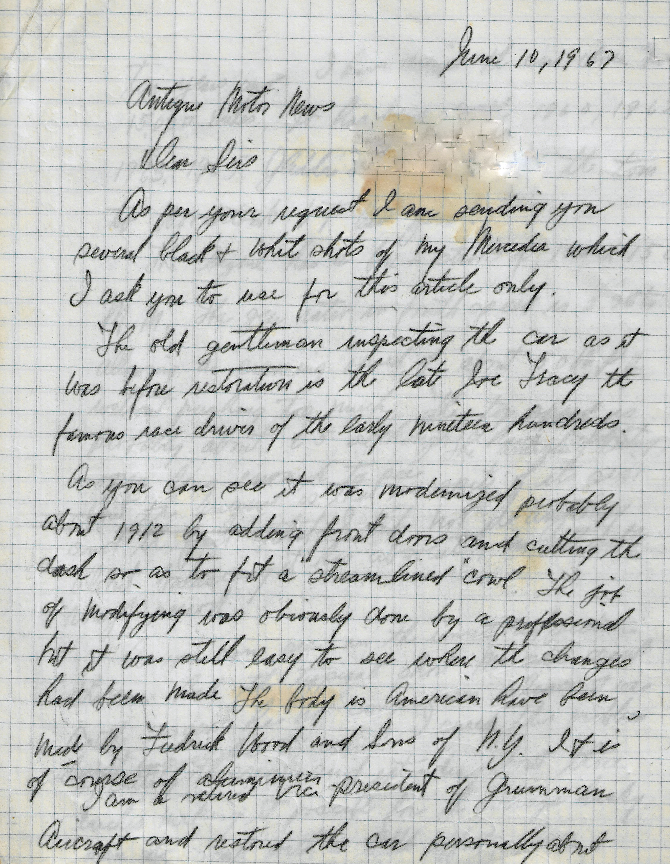 In this June 10, 1967 letter to Stan Pratt, Bill Hoffman provided details on the restoration. Courtesy of the Walter McCarthy Archives.
