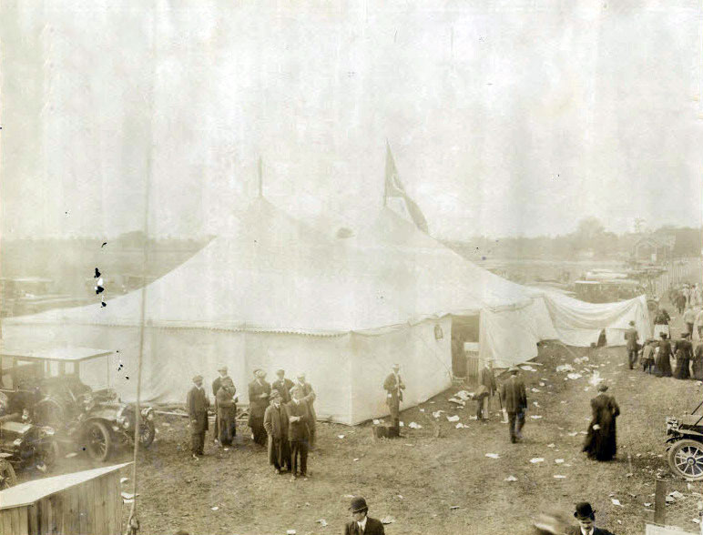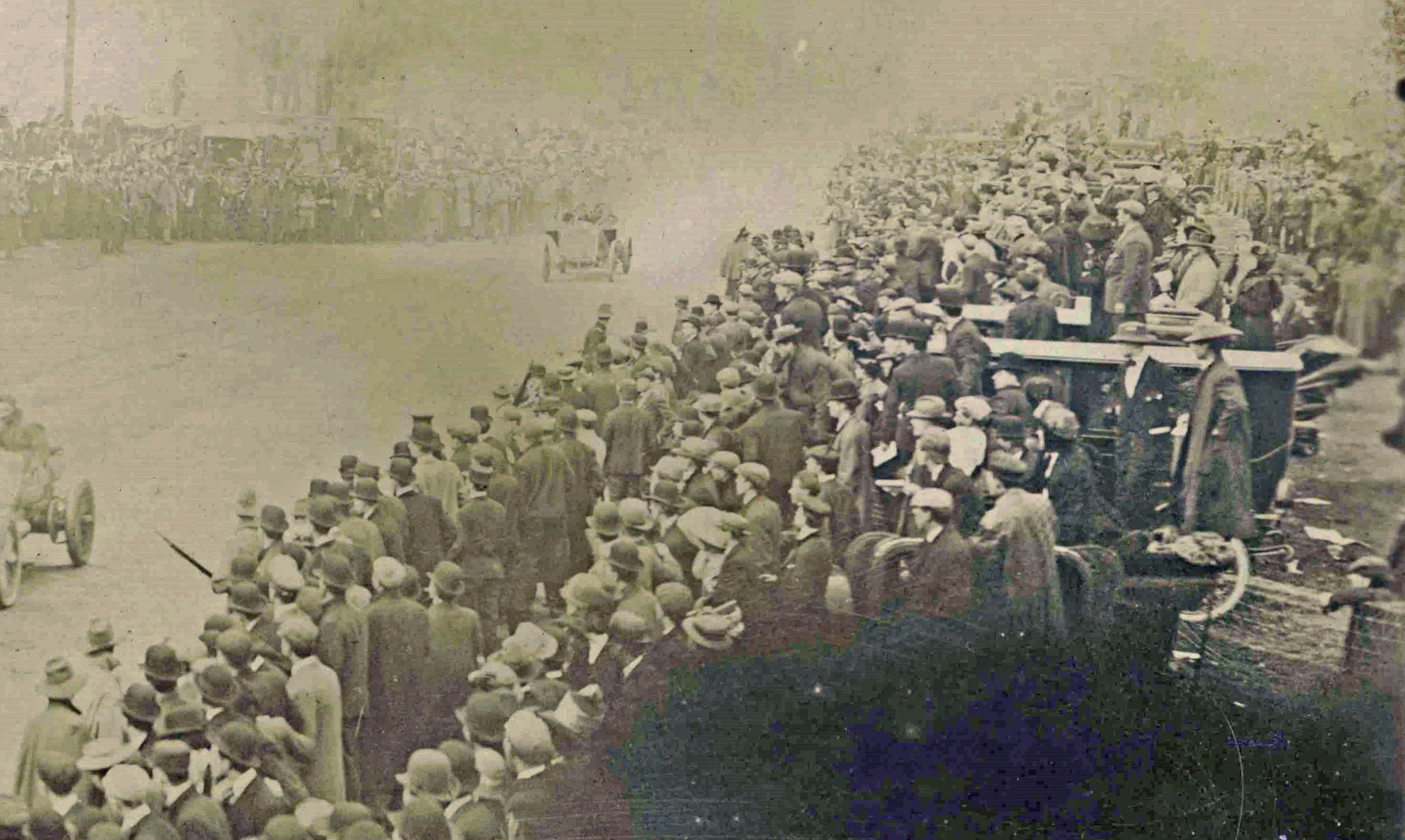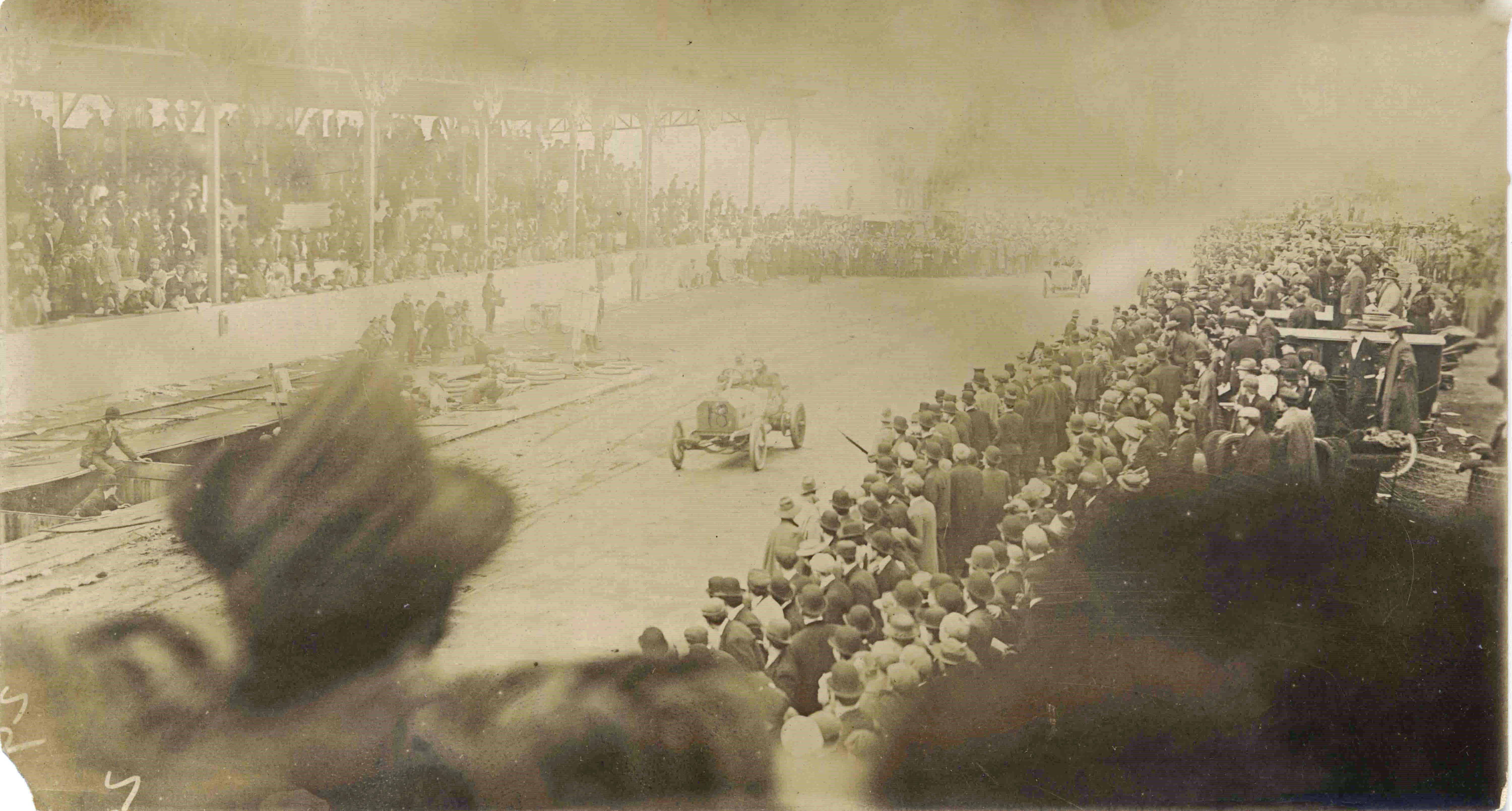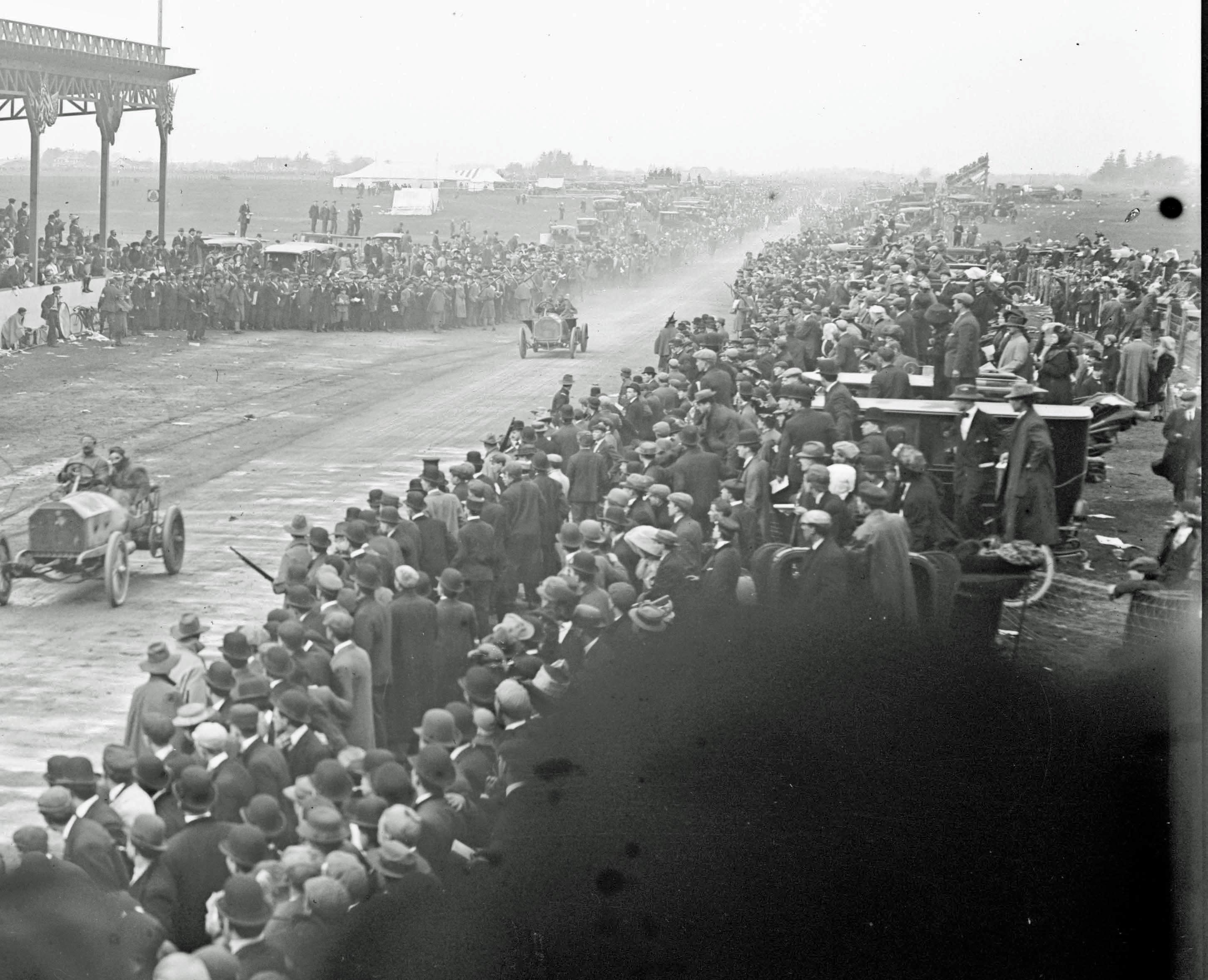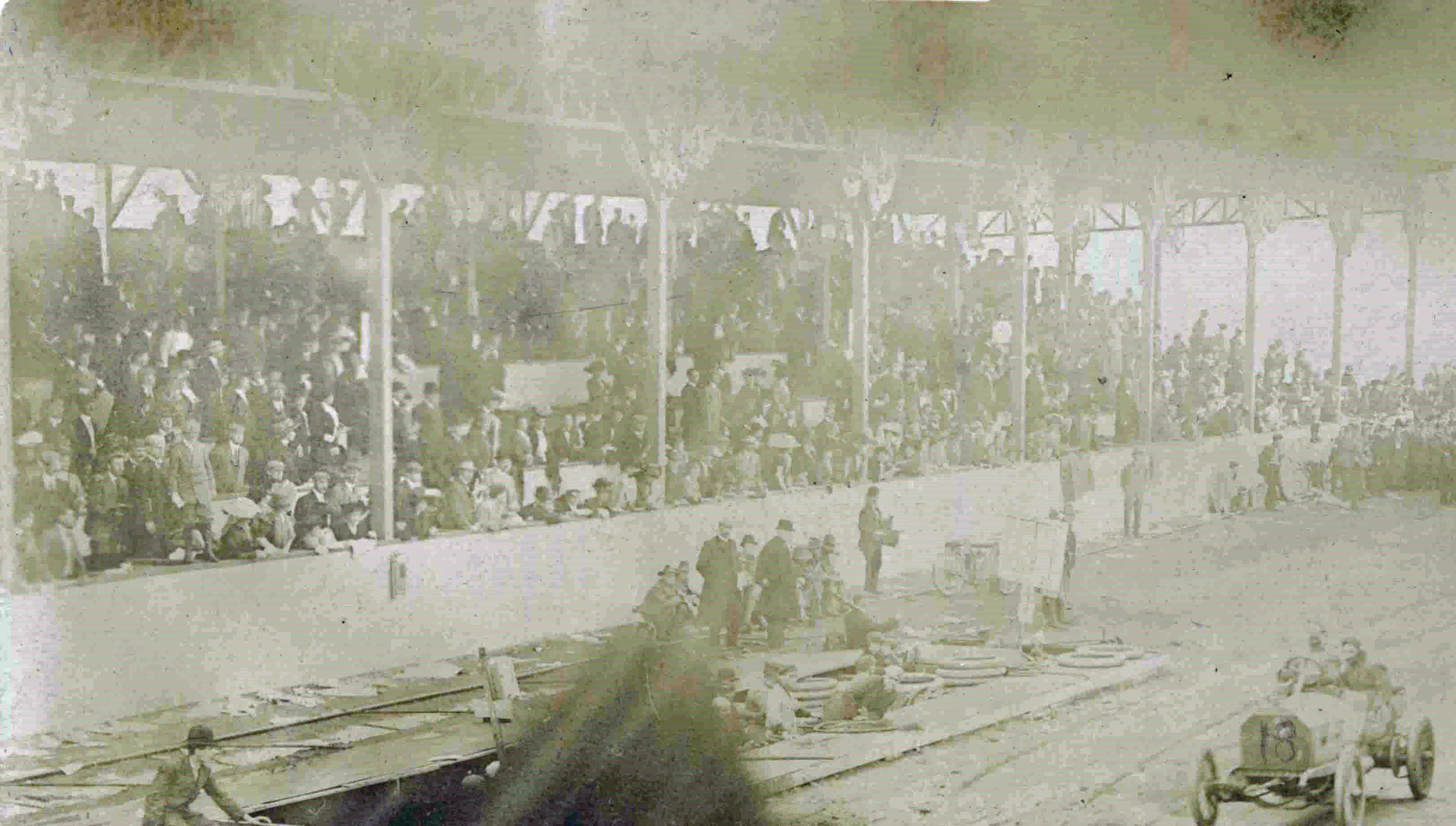 Looks like the 1908 Vanderbilt Cup race at the Levittown grandstand.