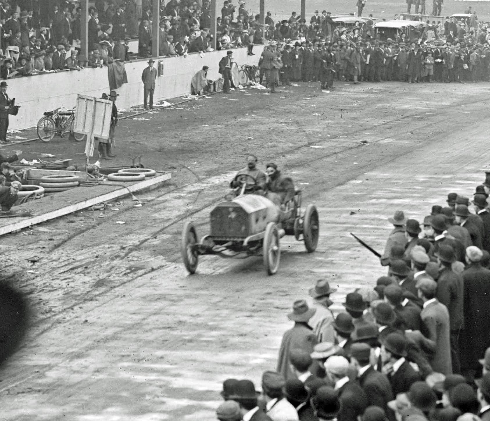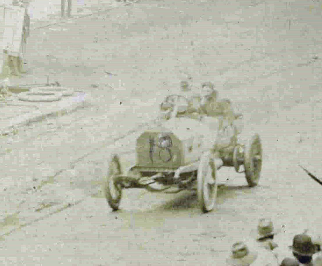 Assuming the number 18 is accurate, I think this might be a photo of Foxhall Keane driving the #18 Mercedes past the grandstands on the LIMP in Hempstead Plains (now Levittown) during the 1908 Vanderbilt Cup Race on October 24, 1908. If I’m right so far, then based on the shape of the front fenders, the car in the background could be the #6 Isotta driven by Herb Lytle.
