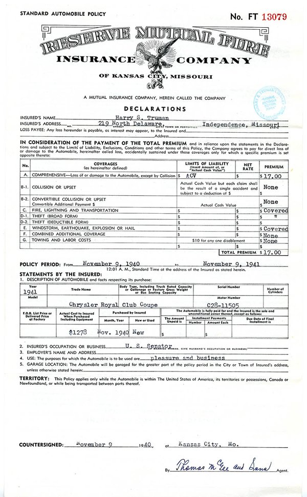 • Famous because it belonged to Senator Harry S. Truman. Senator Truman purchased this Dove Grey colored car on November 9, 1940, and drove it until he became President in 1945. It cost him $1,186, plus an additional $92 for the radio and heater, for a total of $1,278. He purchased it from Lon’s Car Exchange in Kansas City. He also purchased a 1941 Chrysler Windsor 4 door sedan used by his wife at the same time, and traded in a 1940 Chrysler and a 1930 dodge as part of the settlement for the new cars. (see bill of sale & automobile insurance declaration) The car is parked next to the desk he used as a U. S. Senator. Clues used: the reverse image of “The Buck Stops Here” in the glass, and the “Missouri 1941 / 369” license plate.