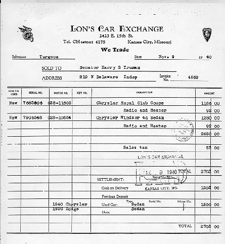 Truman purchasing the two Chryslers with two trade-ins. "