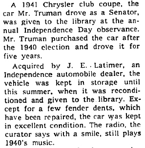 This was Harry Truman’s 1941 Chrysler coupe. He had bought 41 Chrysler sedan for his wife. The license plate is “Missouri”.